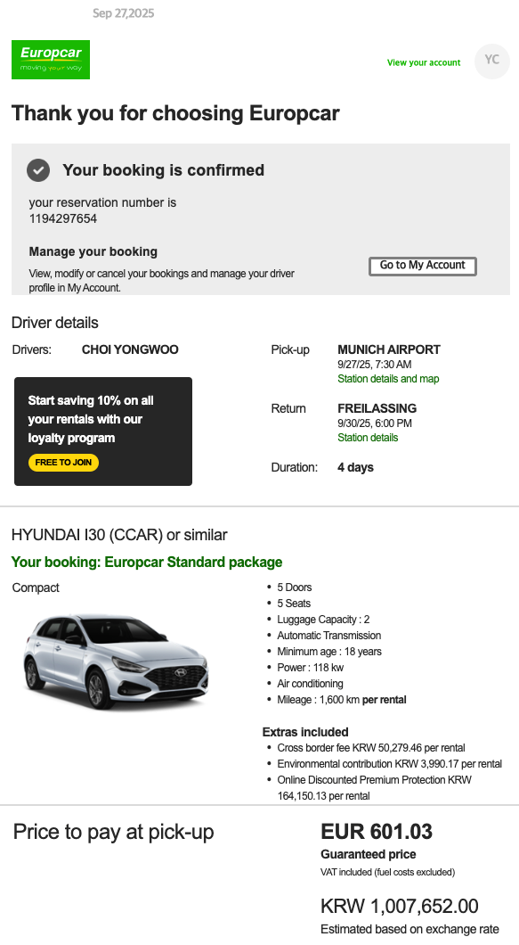 직접 유럽카 사이트에서 예약을 하였고 뮌헨 공항에서 픽업 후 안전하게 프레일라싱에 반납할 수 있었다.