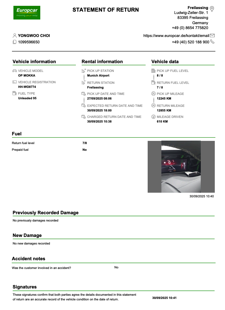 다만 반납할 때 시간이 없어서 기름을 꽉 채우지 못해 50유로의 추가금을 물었고 이것은 반납할 때 담당자와 내가 직접 상의하면서 서명한 내용이다.