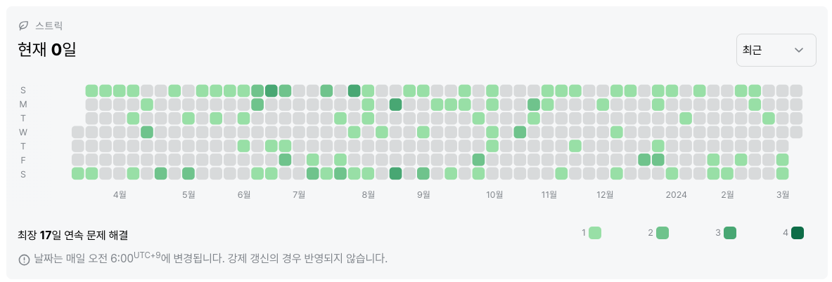 나의 문제풀이 현황. 초록색이 문제를 해결한 날이다.