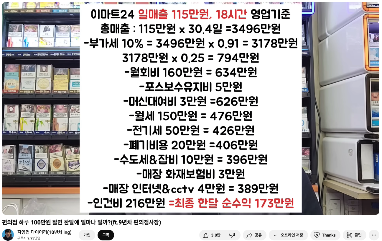 아래 2024년 편의점 주인의 실제 순수익 계산표를 보자.